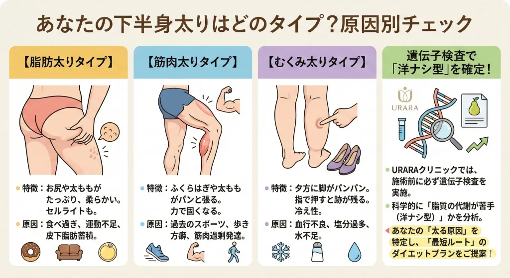 「自分ではどのタイプかわからない…」という方も多いでしょう。URARAクリニックでは、施術の前に必ず遺伝子検査を行います。あなたが遺伝的に「脂質の代謝が苦手で下半身に脂肪がつきやすい(洋ナシ型)」なのか、それとも別のタイプなのかを科学的に分析。