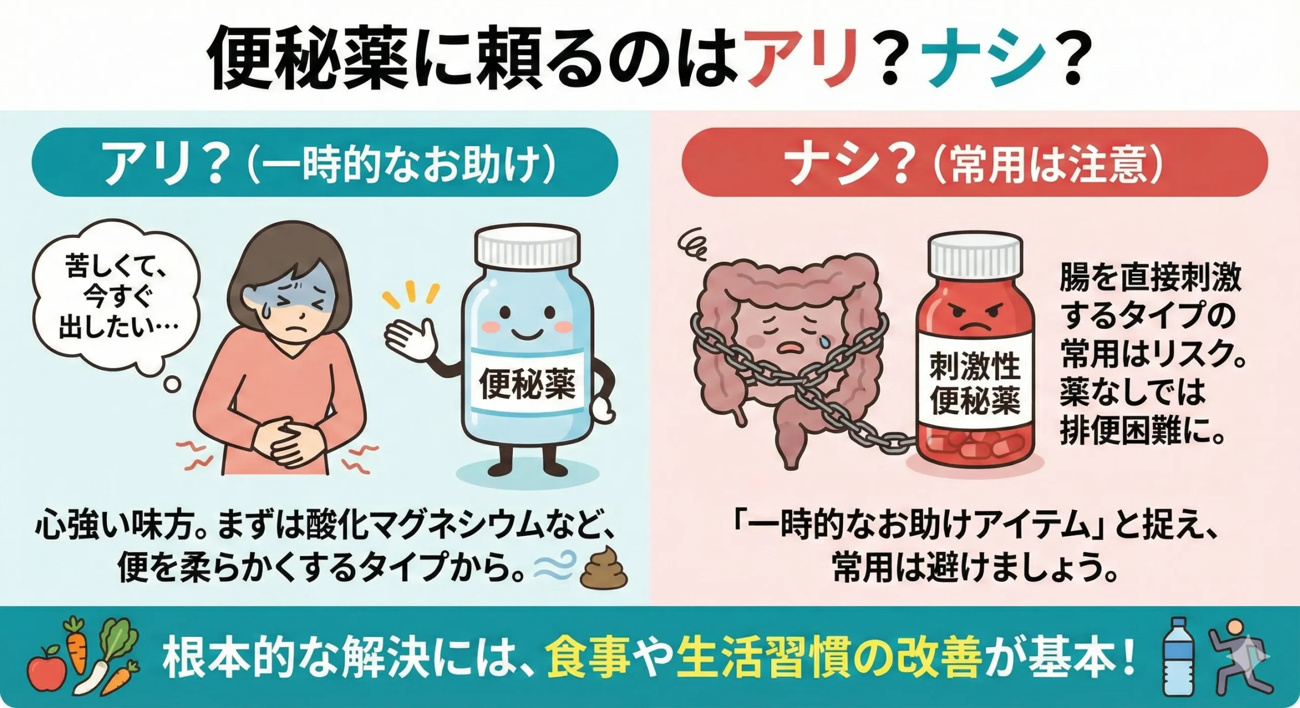 根本的な解決のためには、あくまで食事や生活習慣の改善が基本。便秘薬は「一時的なお助けアイテム」と捉え、常用は避けましょう。