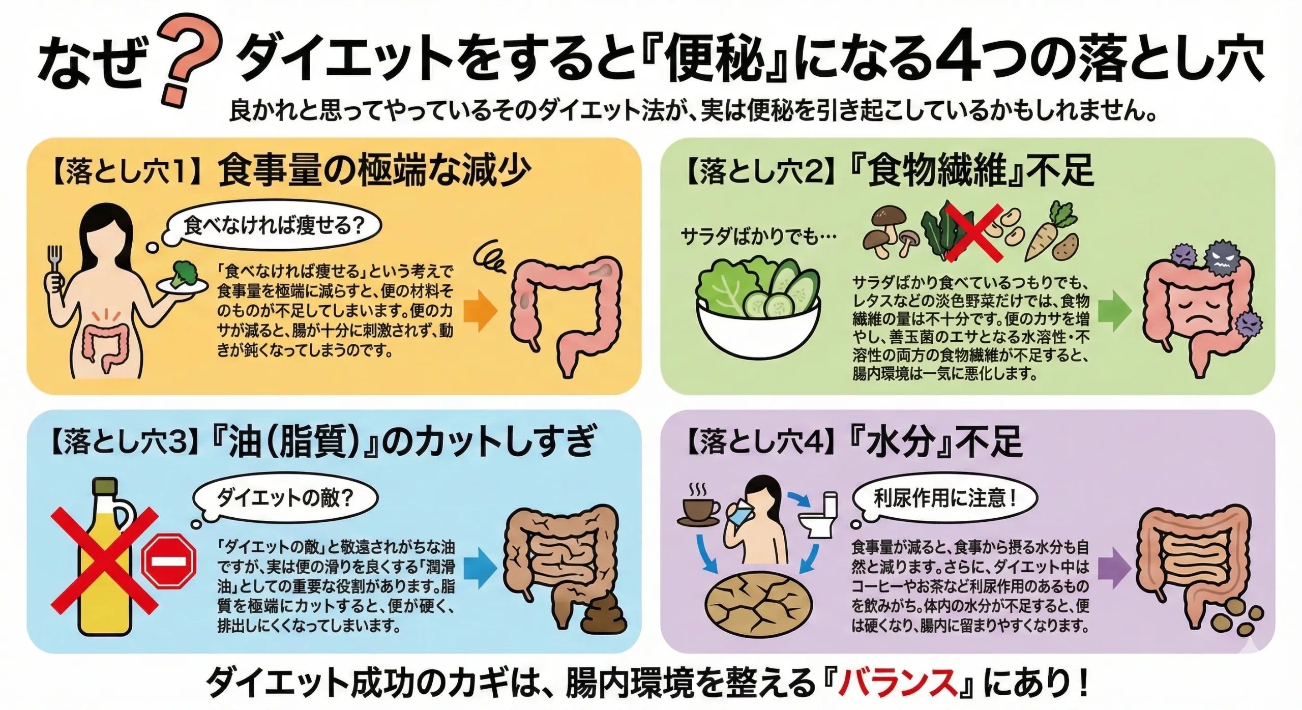 - なぜ、ダイエットをすると便秘になるのか?4つの落とし穴