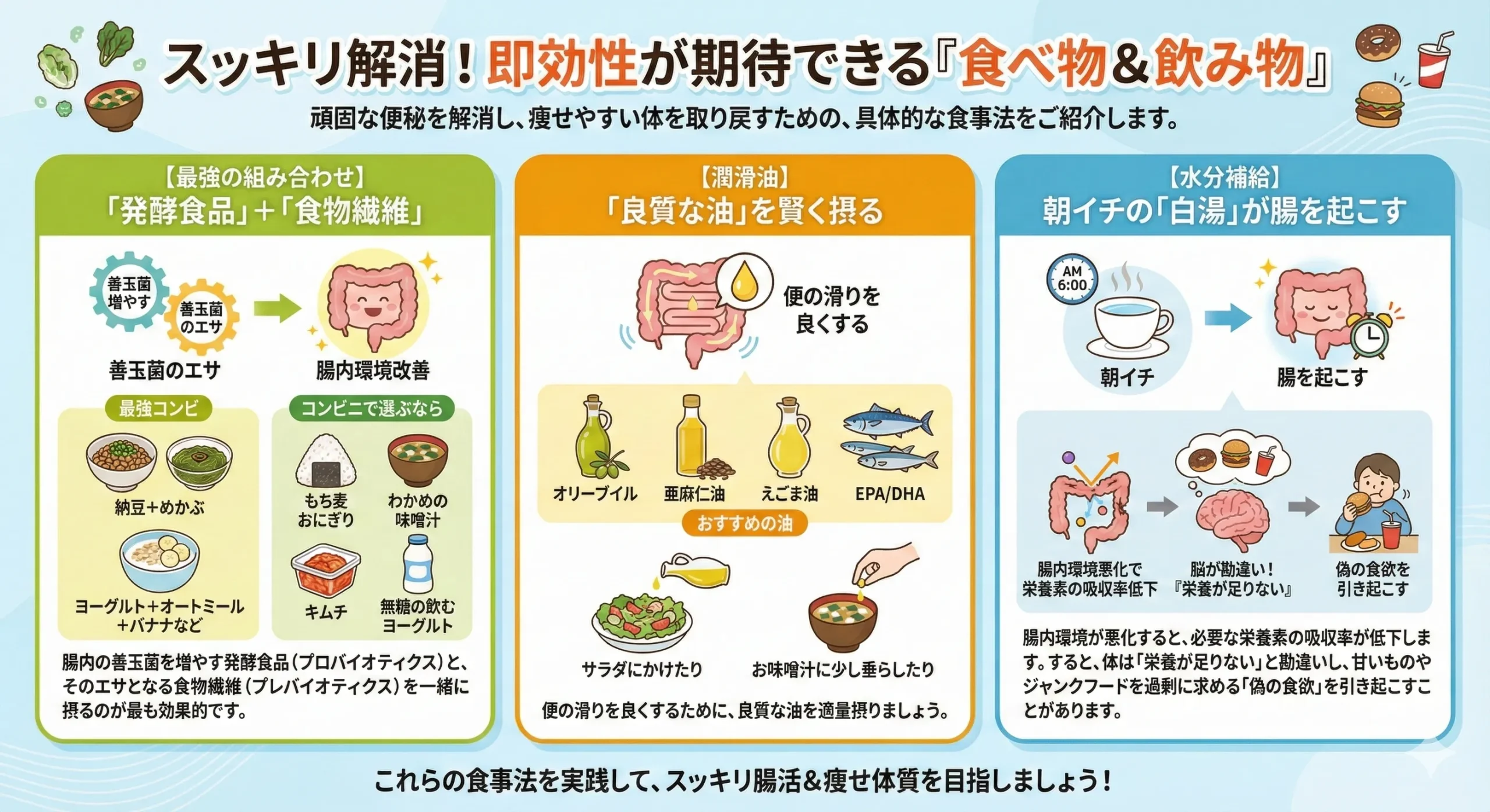 - 最強コンビ:納豆+めかぶ、ヨーグルト+オートミール+バナナなど