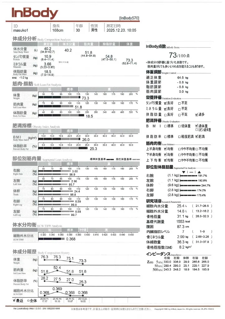 増:inbdyのデータを見てもらえると一目瞭然なのですが、筋肉量を維持しつつ内臓脂肪のみを減らせたことが嬉しいですね。