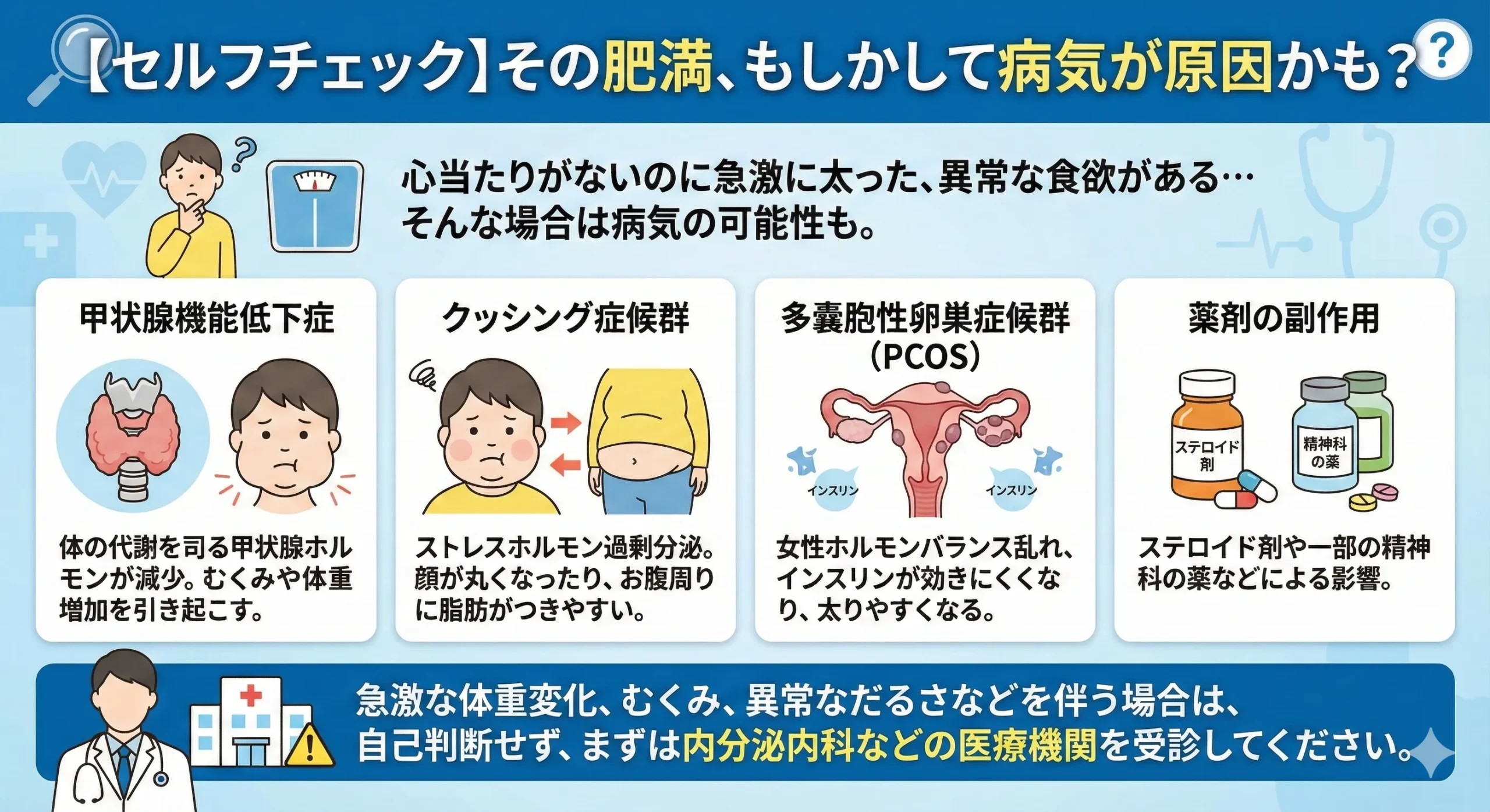 もし、急激な体重変化や、むくみ、異常なだるさなどを伴う場合は、自己判断せず、まずは内分泌内科などの医療機関を受診してください。